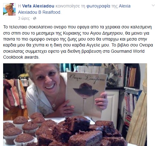 «Το τελευταίο σοκολατένιο όνειρο από τα χεράκια σου, καλεσμένη στο σπίτι σου το μεσημέρι της Κυριακής του Αγίου Δημητρίου, θα μείνει για πάντα το πιο όμορφο όνειρο της ζωής μου, όσο θα υπάρχω. Και μέσα στην καρδιά μου θα χτυπά η δική σου Άγγελε μου". Το βιβλίο σου όνειρα σοκολάτας συμμετέχει φέτος για διεθνή βράβευση στα Gourmand word Cookbook awards».