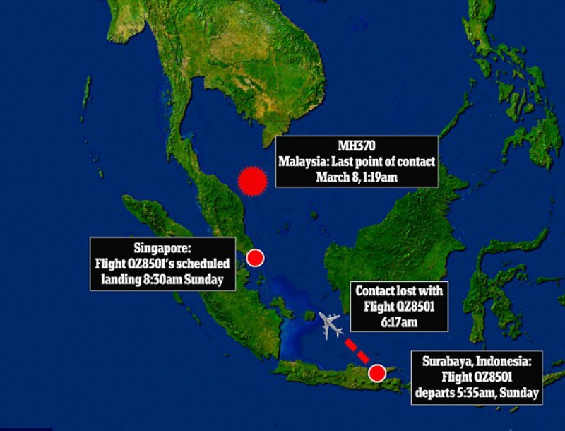 Οι έρευνες επικεντρώνονται στην περιοχή μεταξύ του νησιού Μπελιτούνγκ και της Καλιμαντάν, στη δυτική ακτή του νησιού Μπόρνεο, στο μέσο της πορείας πτήσης.