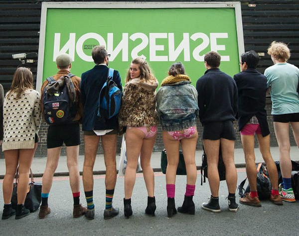 Ωστόσο, τα κασκόλ, τα σκουφάκια, οι μπότες και τα χοντρά παλτό που φορούσαν προσπάθησαν λίγο να ανεβάσουν την θερμοκρασία καθώς από την μέση και πάνω ήταν ντυμένοι κανονικά αλλά από την μέση και κάτω ήταν... ημίγυμνοι. Βασικός κανόνας αυτού του event είναι πως απαγορεύεται να μιλούν ο ένας στον άλλον και να αλληλοκοιτάζονται... χαμηλά.